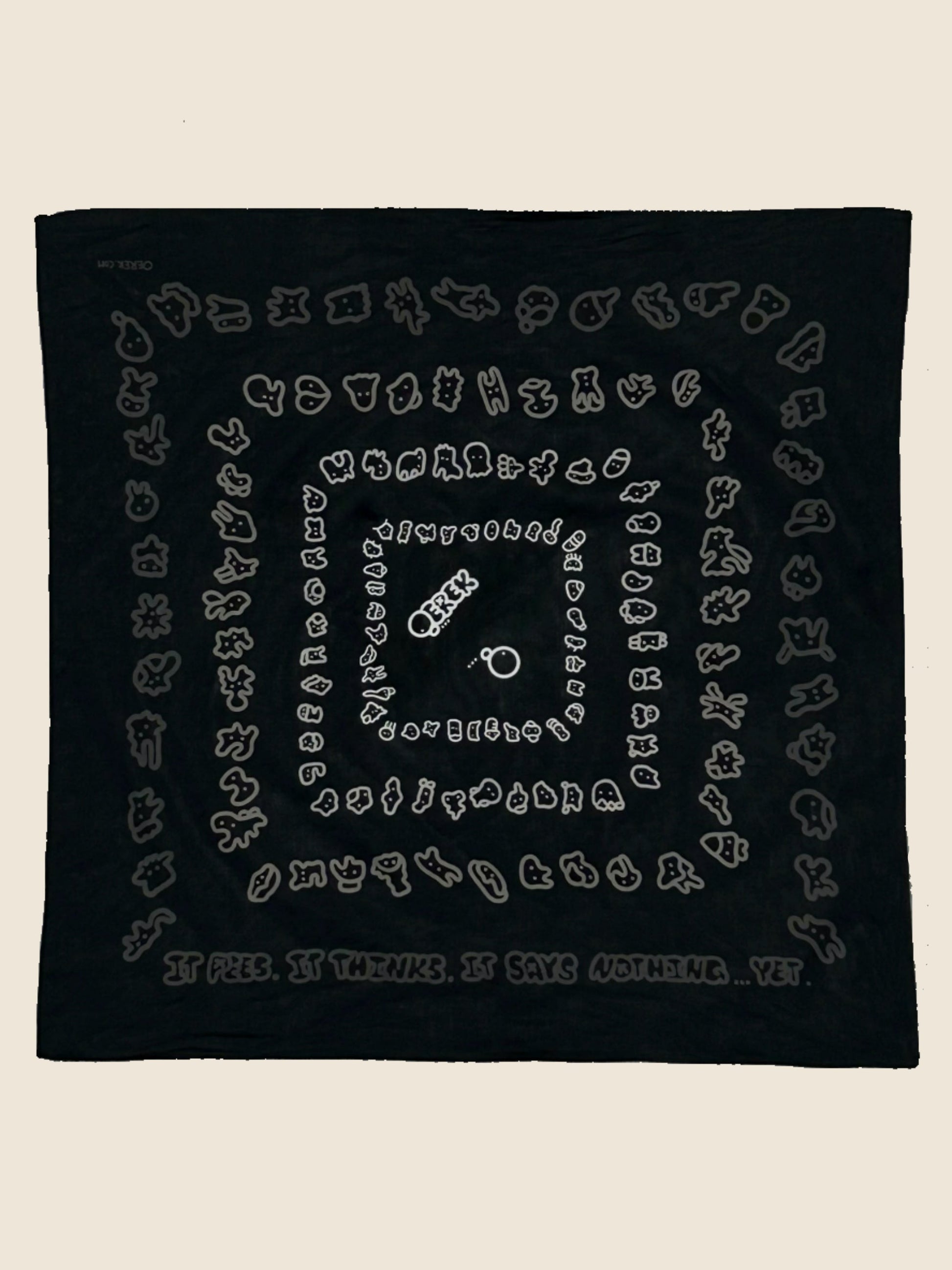 Black OEREK bandana, multi-wear. Rows of doodle faces, ghosts, and odd creatures spiral inward, framing the ‘OEREK tag’ at the center. Tie it, hang it, carry it — a cloth that peers, thinks, but says nothing.